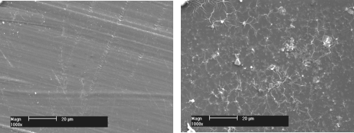 40~180℃、10%硫酸液/汽環境中加速試驗后GDAPC雜化聚合材料(圖左)與其國外耐溫聚合物(圖右)的表面形貌對比圖